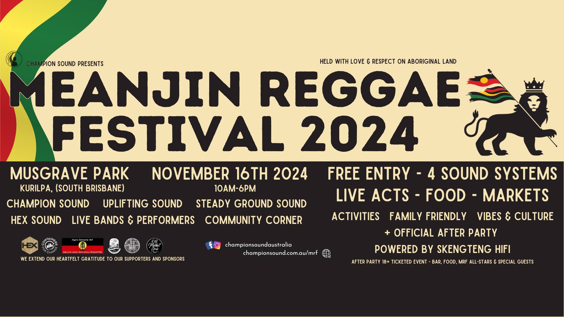 Champion Sound’s flagship event, Meanjin Reggae Festival is Meanjin/Brisbane city’s number one reggae festival, featuring multiple hand-crafted sound systems, live performers, arts and culture, activities, market stalls, food trucks and more, spread out across the park. And, as always, it is FREE to attend!
