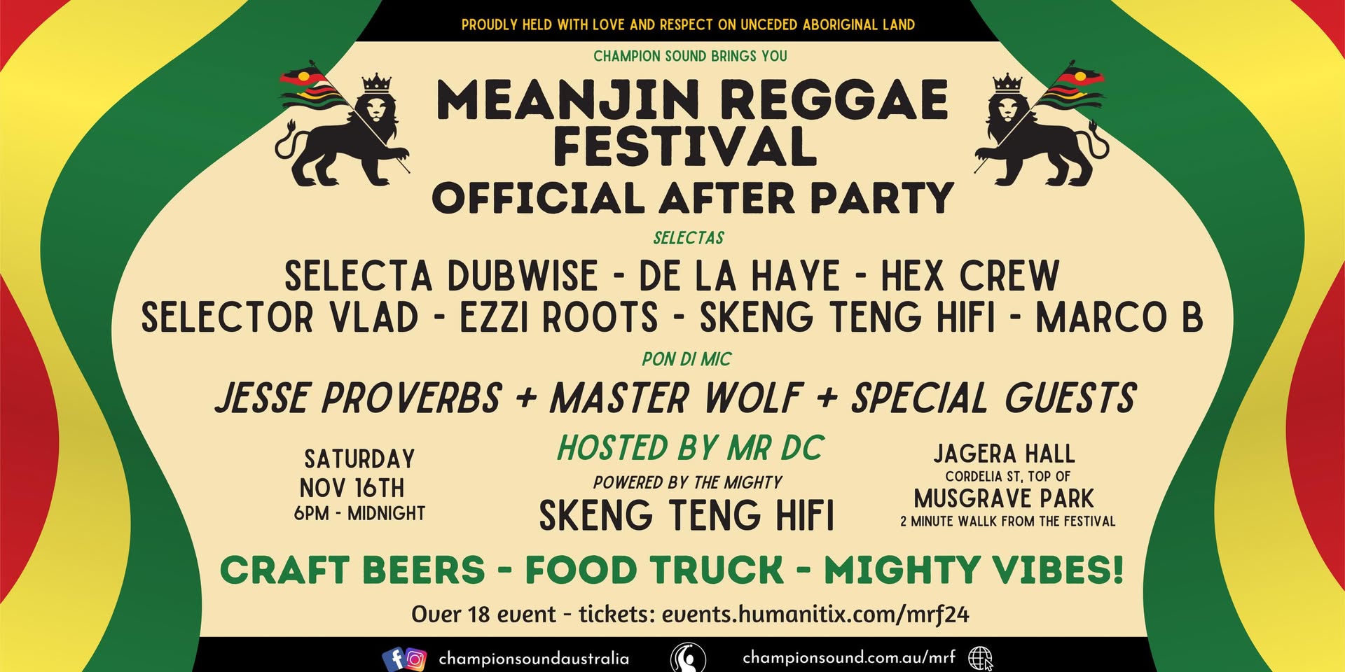 This is the official after party for the Meanjin Reggae Festival 2024. Solid vibes from start to finish! The after party continues the sound system theme of the festival, and is one of our main fundraising activities which helps us to put on the day’s event.
